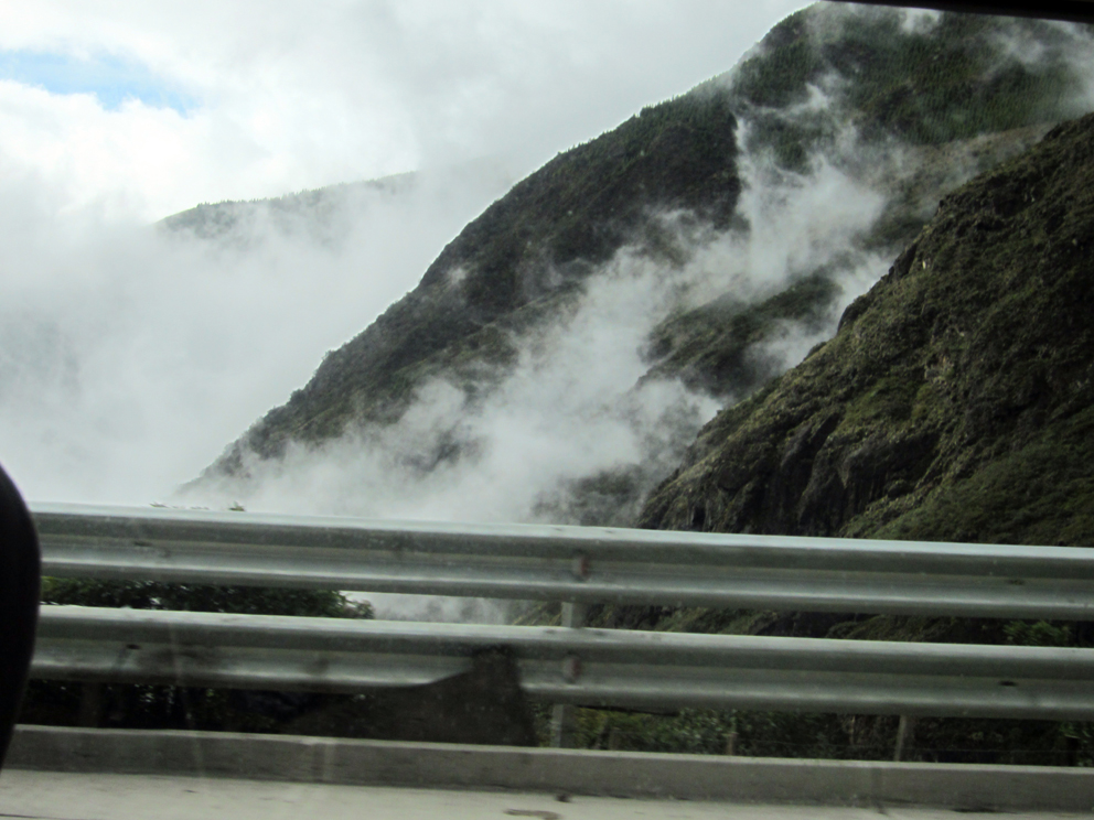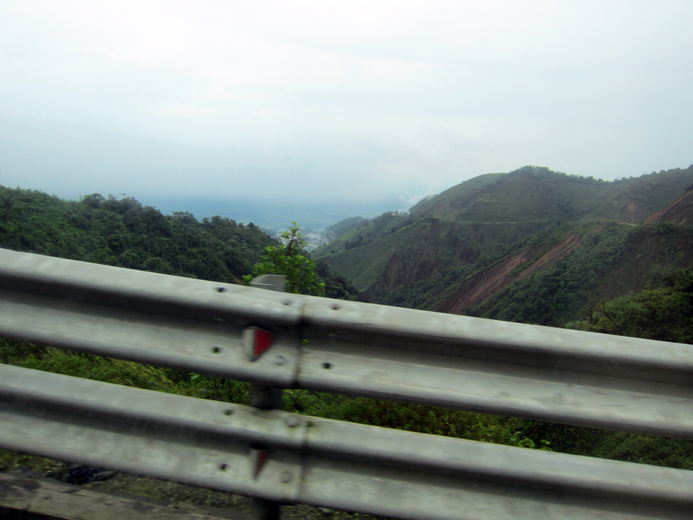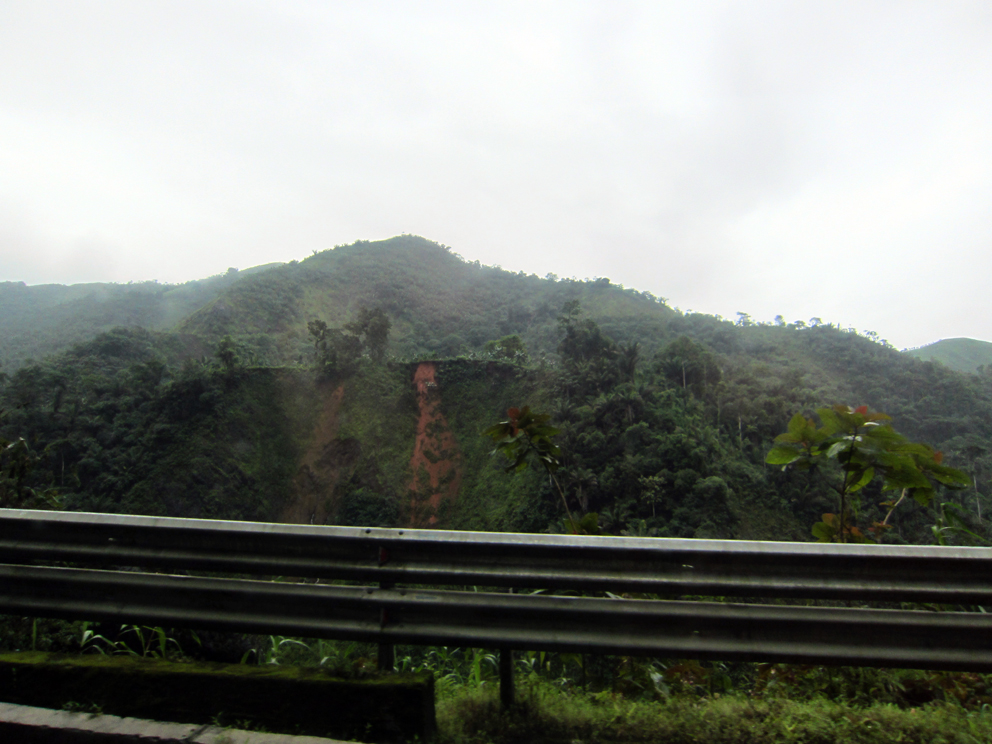 Die Fahrt von der Passhöhe in die Tiefebene: ich habe nicht viel gesehen, da die feuchtwarme Pazifikluft ihre Feuchtigkeit beim Aufstieg in die kühlen Andenhöhen abgibt. Teileweise gab es Nebel mit Sichtweiten unter 50m und heftige Niederschläge. Wenn es gut geht, dann erfolgt die Abfahrt auf einer sehr guten Straße ohne Schwierigkeiten. Leider kommt es immer wieder vor, dass ein Erdrutsch von den steilen Hängen (rechts steil 300m hoch, links 300m steil nach unten) die Straße blockiert. Auf meiner Reise nach Guayaquil waren etliche Bauarbeiter an einer Stelle mit den Aufräumarbeiten nach einem Erdrutsch beschäftigt. Ist man in der Tiefebene angelangt, dann wird man mit feucht-heißer Luft mit Temperaturen von über 30° bei einer Luftfeuchtigkeit von über 80% empfangen.
