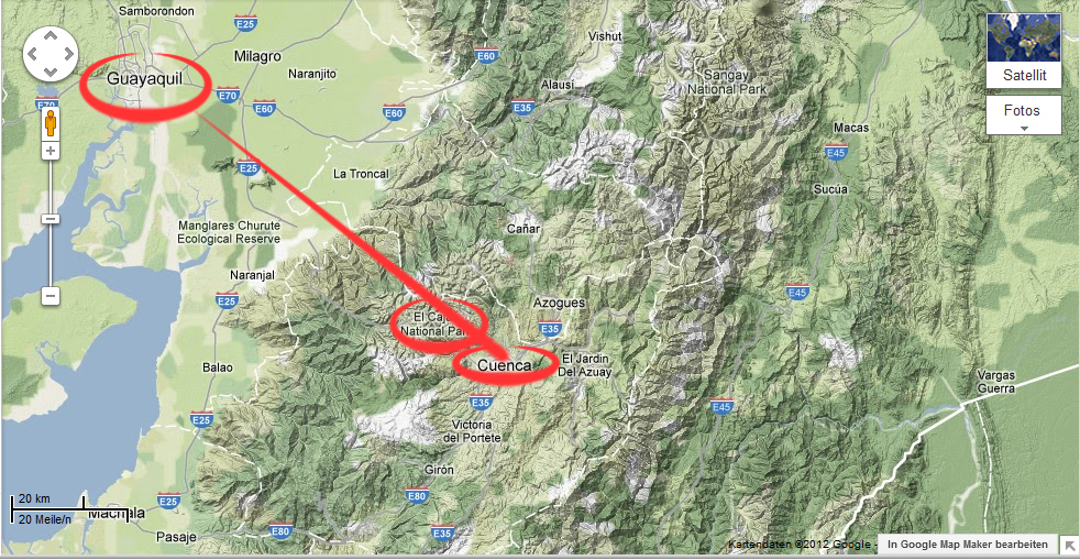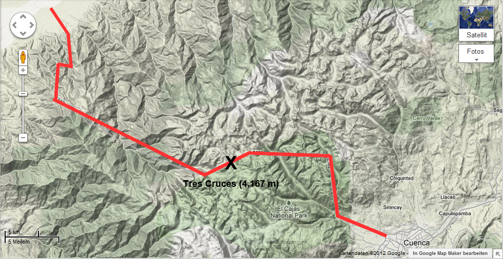 Möchte man von Cuenca in ein anderes Land fliegen, dann geht dies nur über den Umweg über die Flughäfen Guayaquil (126km) oder Quito (304km). Der Flugpreis in die beiden Städte liegt bei etwa $50 (einfacher Flug). Die reine Flugzeit ist nahezu gleich: 35 – 40 Minuten. Von Cuenca aus hat man allerdings auch die Möglichkeit mit einem Kleinbus für $12 durch den Nationalpark Cajas nach Guayaquil zu fahren. Die Fahrtzeit beträgt etwa 3 Stunden. Für meinen Flug nach Lima Ende März hatte ich diese Variante gewählt – allerdings war ich der einzige Mitfahrer in einem extra Kleinbus. Die Fahrt durch den Nationalpark Cajas (Parque Nacional El Cajas) ist ein Erlebnis, dass man nicht versäumen sollte.